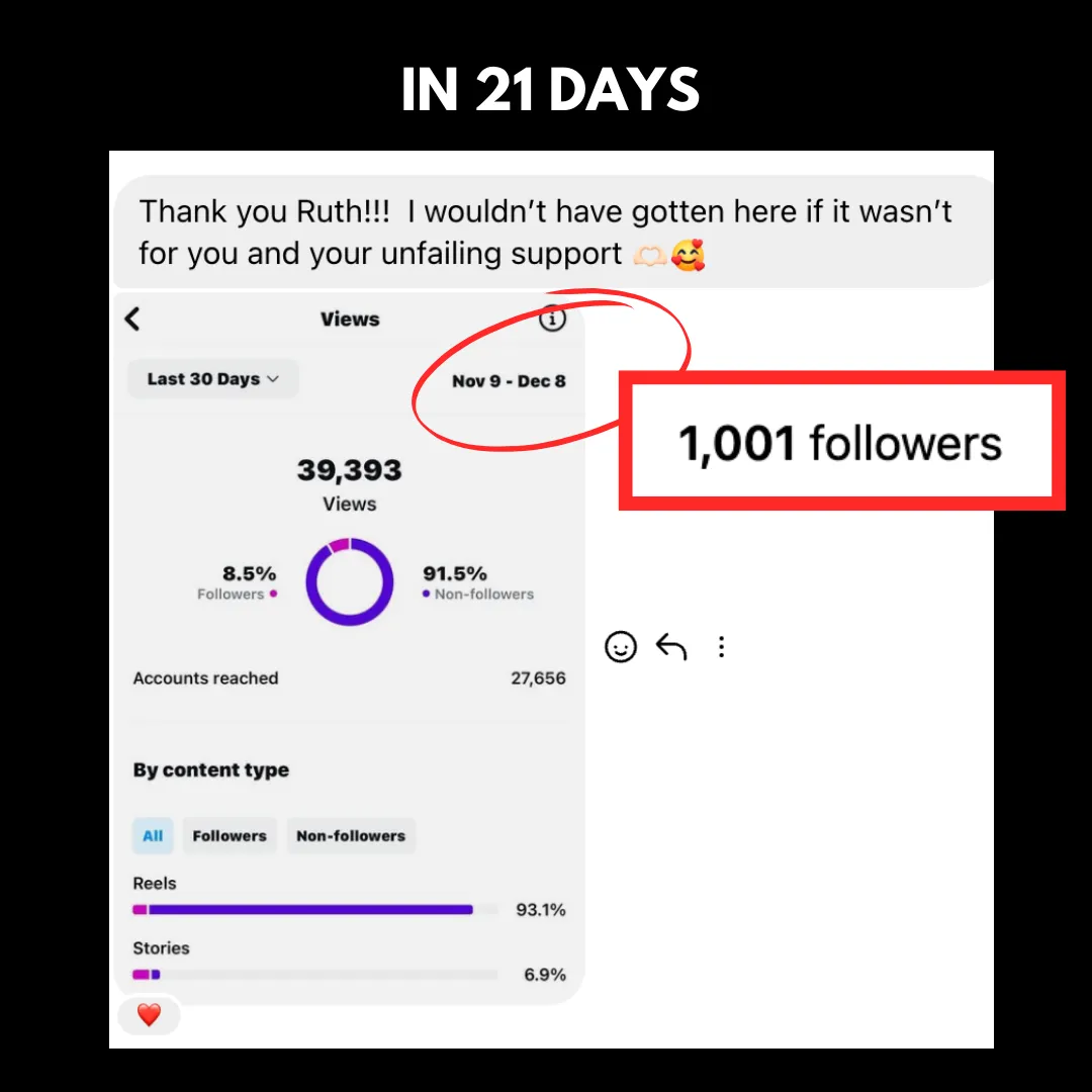 💰 Help an overwhelmed stay-at-home mom to grow her followers from 0 to over 1,005 within 3 weeks, finally unlocking DMs from paying clients ready to buy her offers.
